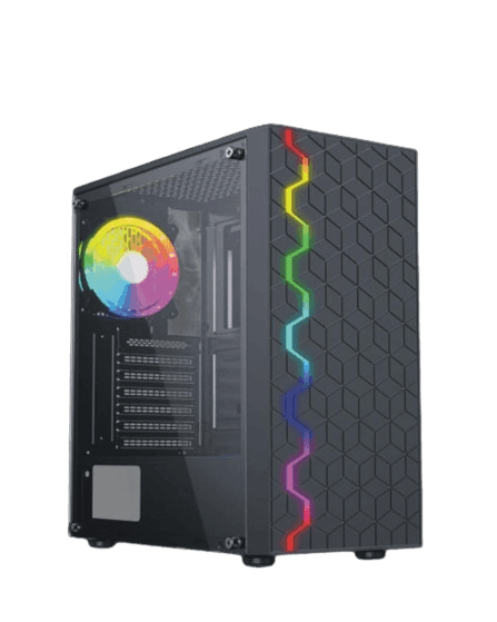 **Design and Build:** Mid-tower with SPCC steel and optional tempered glass side. Front mesh or panel for airflow. **Fans:** Supports 3x RGB fans (not pre-installed in base model); up to 6x 120mm total. **Compatibility:** ATX/M-ATX/ITX; GPU up to 300mm; CPU cooler up to 160mm. 7 expansion slots. **Cooling Options:** Front/top/rear fan mounts; 240mm radiator support. **I/O and Dimensions:** USB 3.0 x1, USB 2.0 x2, HD Audio. Dimensions: Approx. 400x200x450mm. Storage: 2x 3.5 HDD, 2x 2.5″ SSD. **Additional Features:** RGB front panel lighting; PSU shroud. Based on Thunder’s general TGC series like Nitro or Diesel.”